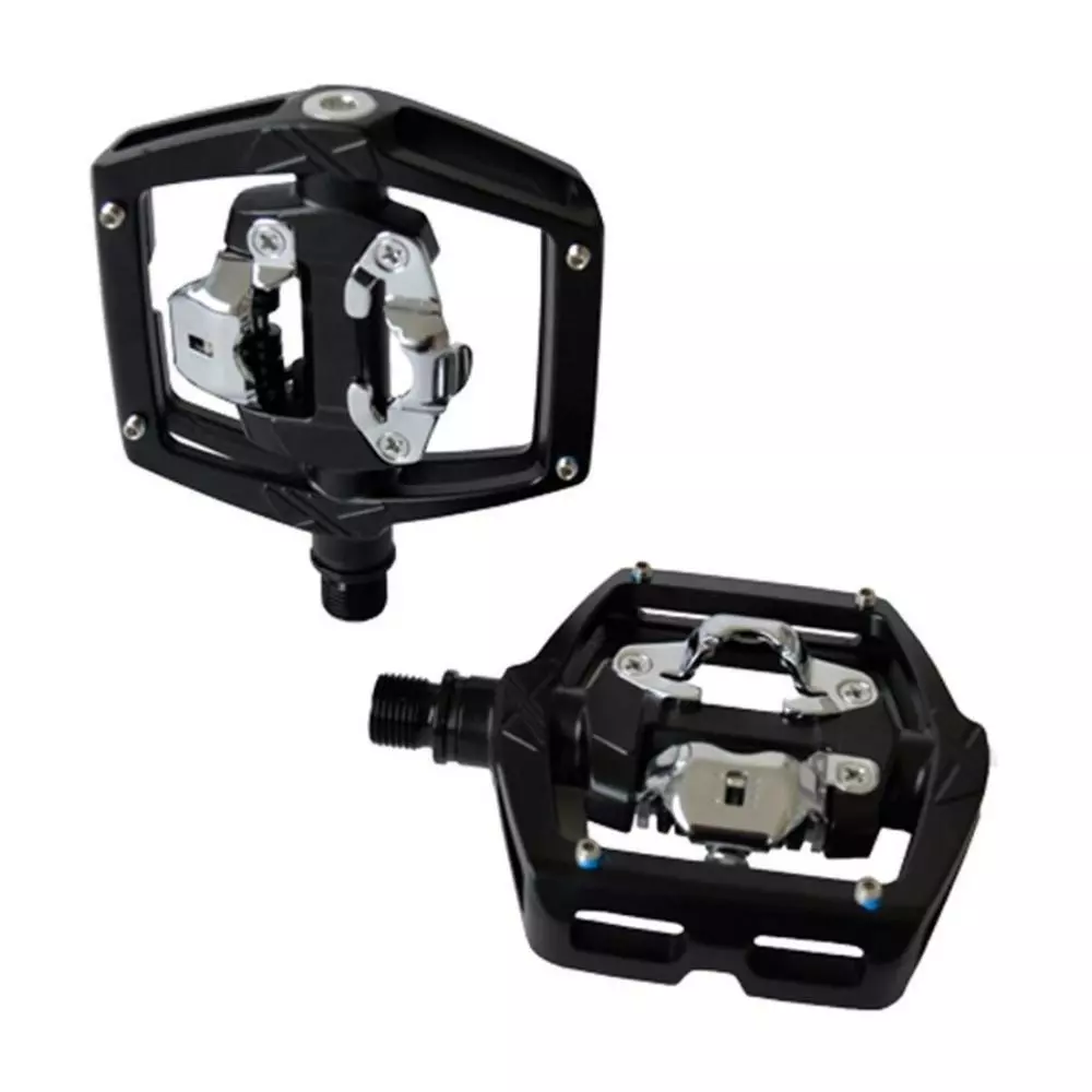 XLC Kombipedal med ekstra stor trædeflade. Pedalen er fremstillet i aluminium med en stærk aksel i Crmo. Lejerne er forseglede og kan tilgås ved service. Denne pedal er tiltænkt til Mountain Bike og Gravel cykellisten men den kan bruges på lige den cykel du synes det skal bruges til. Der er almindelig trædeflade på den ene side og click system på den anden side så du både kan bruge den med almindelige sko og med cykelsko. Der er klamper med til pedalerne og de er SPD kompatible.